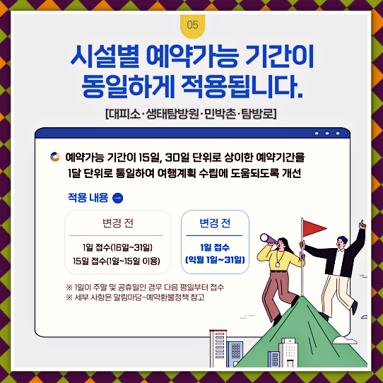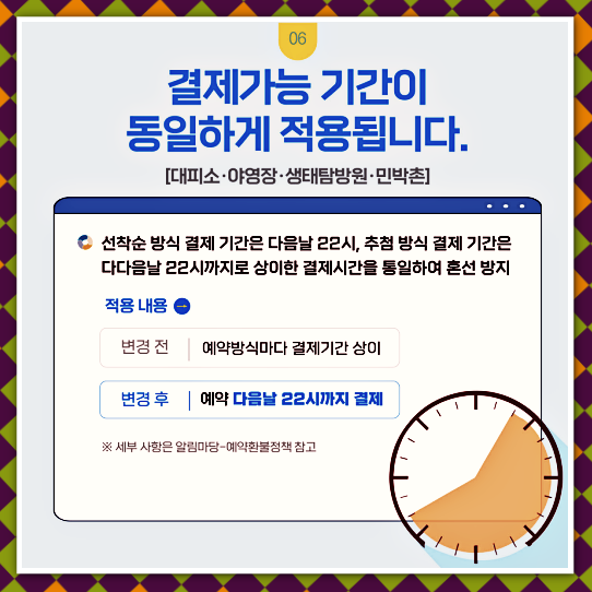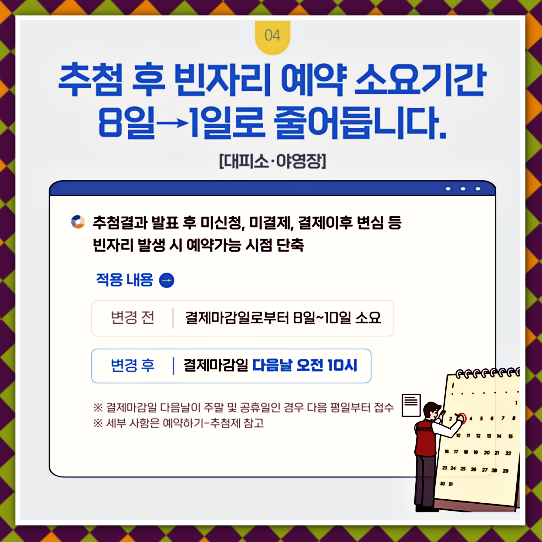 예약 변경 및 취소: 시설 변경은 빈자리 접수 전까지 제한됩니다. 미 신청 건, 본인 취소 건, 시간 내 미결제로 인한 자동 취소 건 등으로 발생하는 빈자리는 선착순 방식으로 접수 가능합니다.