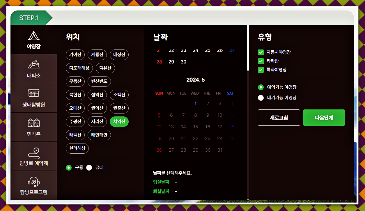 야영장 예약을 위해서는 반드시 PC를 이용하여 국립공원 예약통합시스템으로 접속한 뒤 야영장 위치와 날짜, 유형 등을 선택하여 예약을 진행할 수 있습니다.