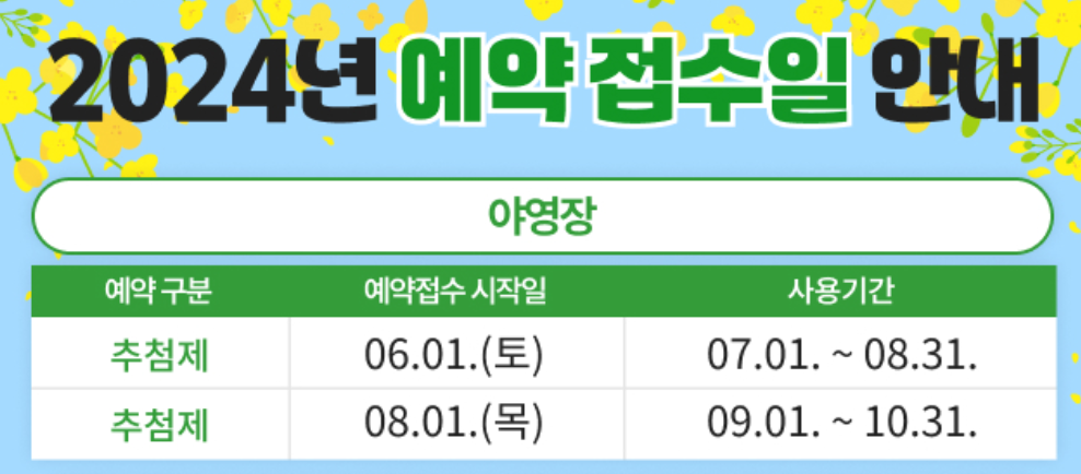 24년부터는 야영장을 이용하기 위한 예약 방식이 새롭게 바뀌었습니다. 이제부터 야영장 예약은 선착순이 아닌 추첨제로 진행되며, 예약통합시스템을 통해 신청할 수 있습니다.