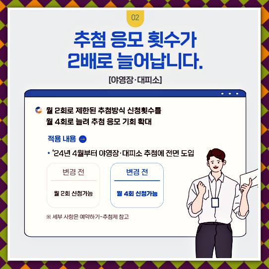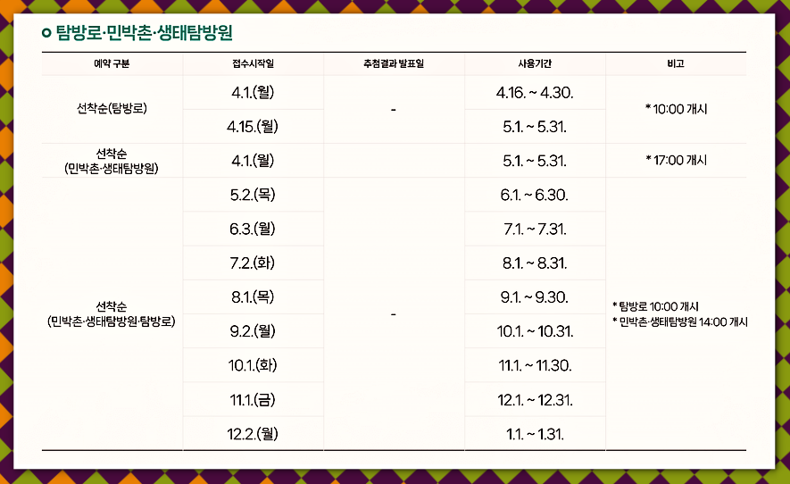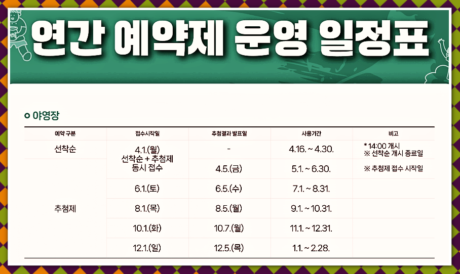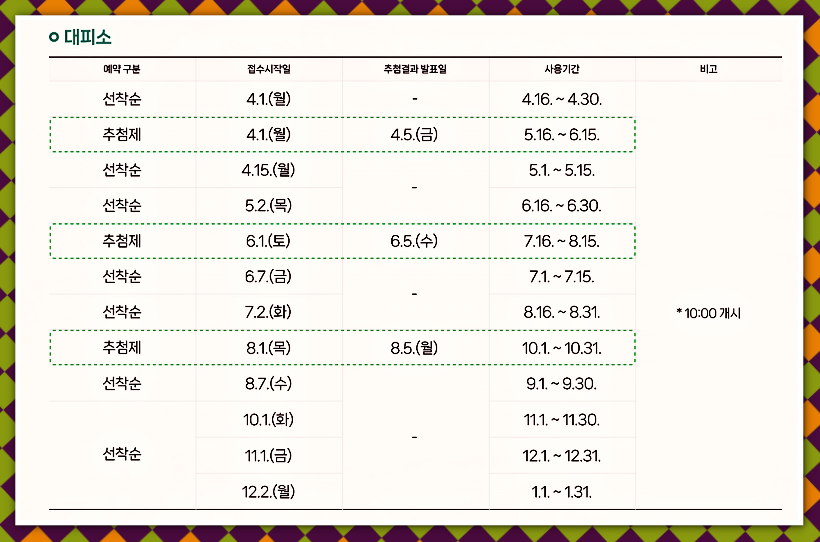 신청 기간과 추첨제: 예약은 2024년 4월 1일부터 5일까지 가능하며, 추첨제로 운영됩니다. 이 기간 내에 신청하고, 최종 추첨 결과는 4월 5일 오후 4시에 확인할 수 있습니다.