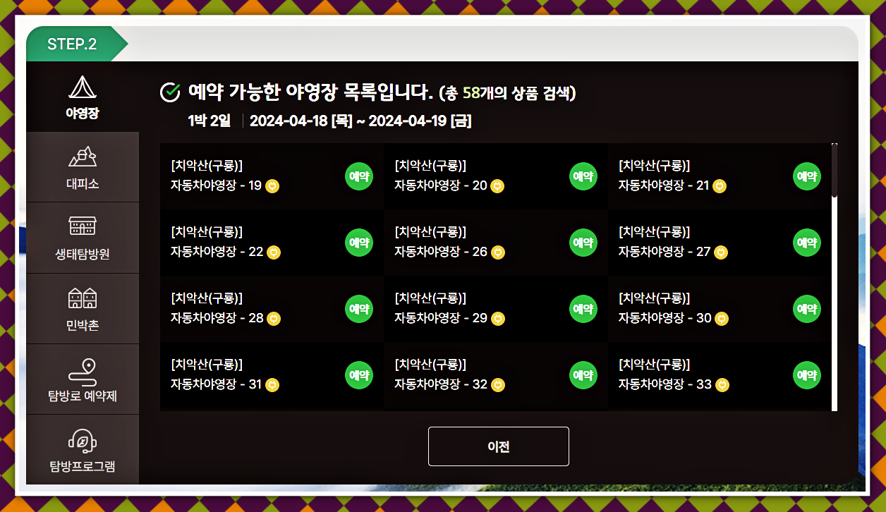3. 예약 진행: 검색 조건에 맞는 야영장을 확인하고, 원하는 야영장을 선택해 예약을 진행합니다.