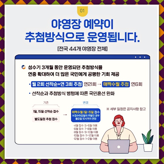 기존 국립공원 야영장 예약방식은 이용객이 많은 봄, 여름, 가을, 성수기 등은 추첨방식을 이용하고 나머지 기간에는 선착순으로 진행해 왔습니다. 이러다 보니 늦게서 이용하고자 하는 사람들은 예약을 실패하는 등 경쟁이 심해지는 일들이 발생하기 시작하여 예약방식을 대대적으로 변경했습니다.
