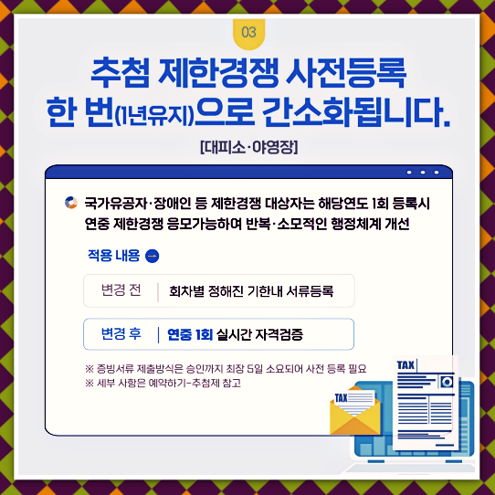 장애인 및 국가유공자: 등록 및 증빙서류 제출 기간은 3월 27일부터 4월 3일까지입니다.