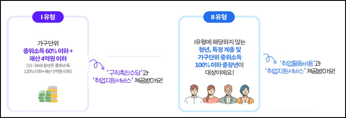 요건심사형: 15세 이상 69세 이하의 구직자 중 중위소득 60% 이하, 재산 4억 원 이하의 조건을 충족하며 최근 2년 안에 100일 또는 800시간 이상의 취업 경험이 있는 경우.