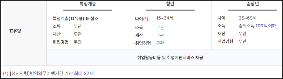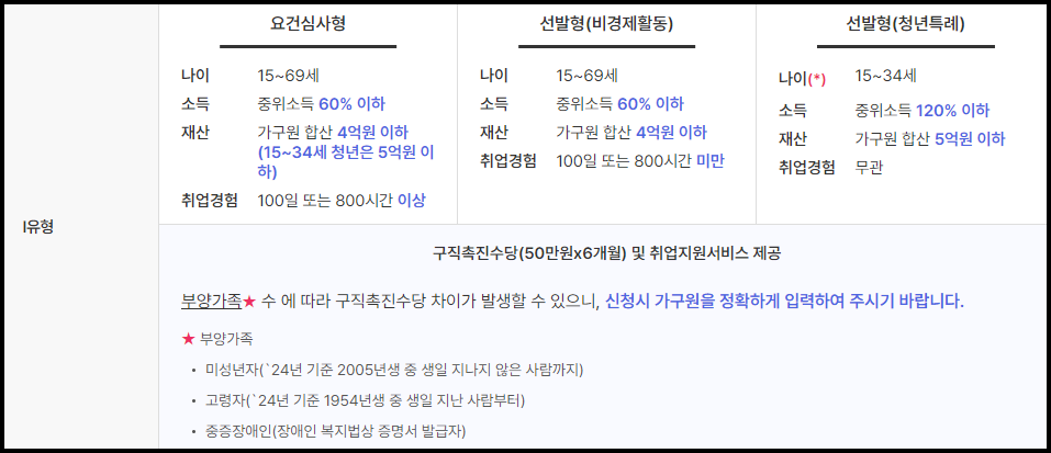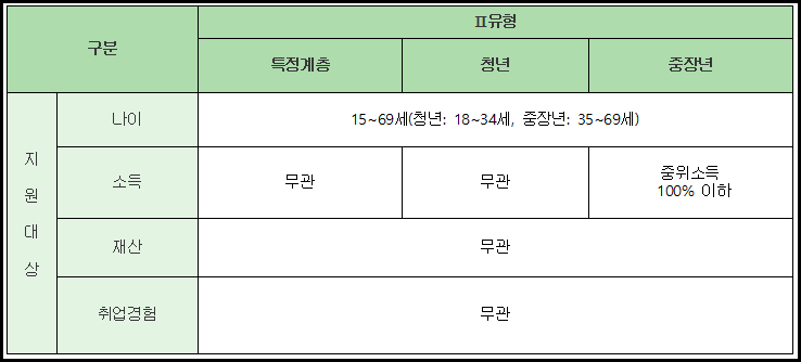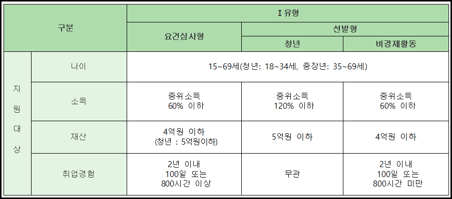 요건심사형: 15세 이상 69세 이하의 구직자 중 중위소득 60% 이하, 재산 4억 원 이하의 조건을 충족하며 최근 2년 안에 100일 또는 800시간 이상의 취업 경험이 있는 경우.