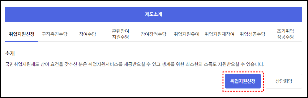 - 국민취업지원제도 홈페이지 접속: 홈페이지에 접속하여 지원 신청 버튼을 클릭합니다.