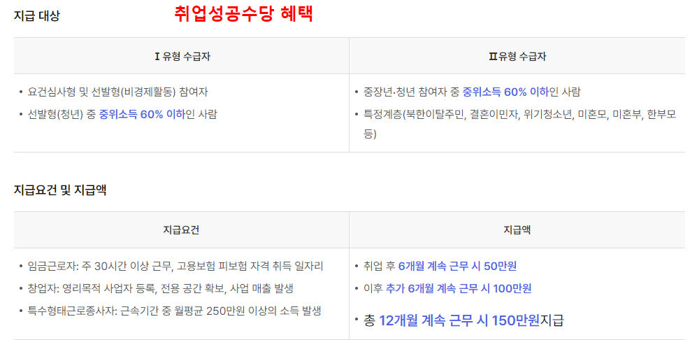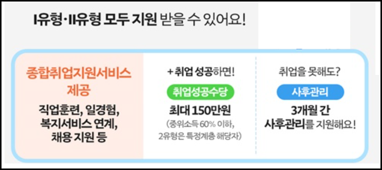 1 유형은 2 유형보다 대상조건이 까다로우며, 구직촉진수당을 포함한 다양한 취업지원 서비스를 제공합니다. 2 유형은 1유형보다 넓은 범위를 대상으로 하며, 취업활동비용과 취업지원서비스를 주로 지원합니다.