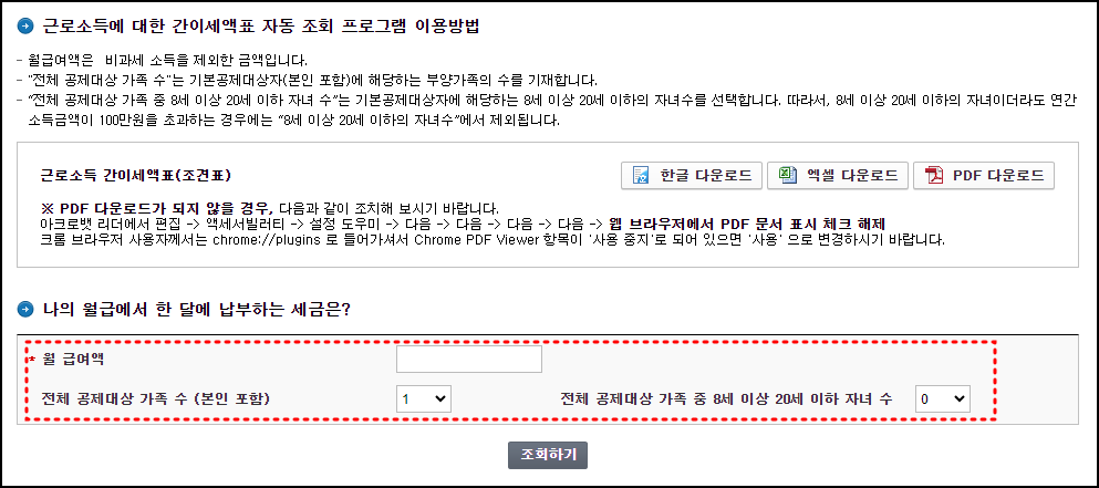 해당 경로로 접속하면 근로소득세 계산기를 이용할 수 있습니다. 근로소득세 계산기 이용 시에는 월급여액과, 전체 공제대상 가족수, 공제대상 가족 중 8세 이상 20세 이하 자녀 수를 정확하게 입력해 주고 '조회하기'를 선택하면 됩니다.