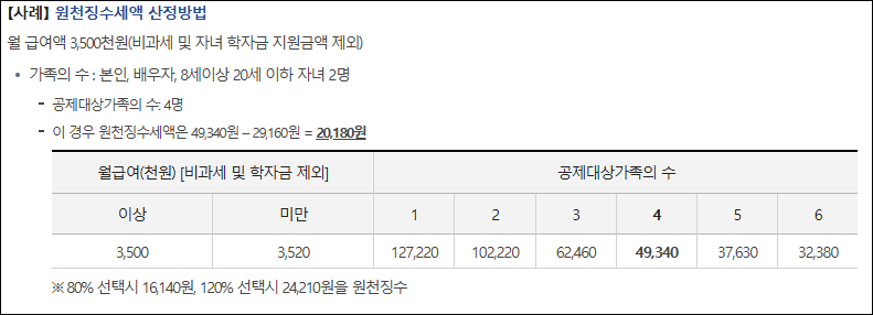 예를 들어, 월 급여가 3,500천 원(비과세 및 자녀 학자금 지원금액 제외)인 경우, 공제 대상가족 수가 4명(8세 이상 20세 이하 자녀 2명)이라면 원천징수세액은 49,340원에서 29,160원을 뺀 20,180원이 됩니다.