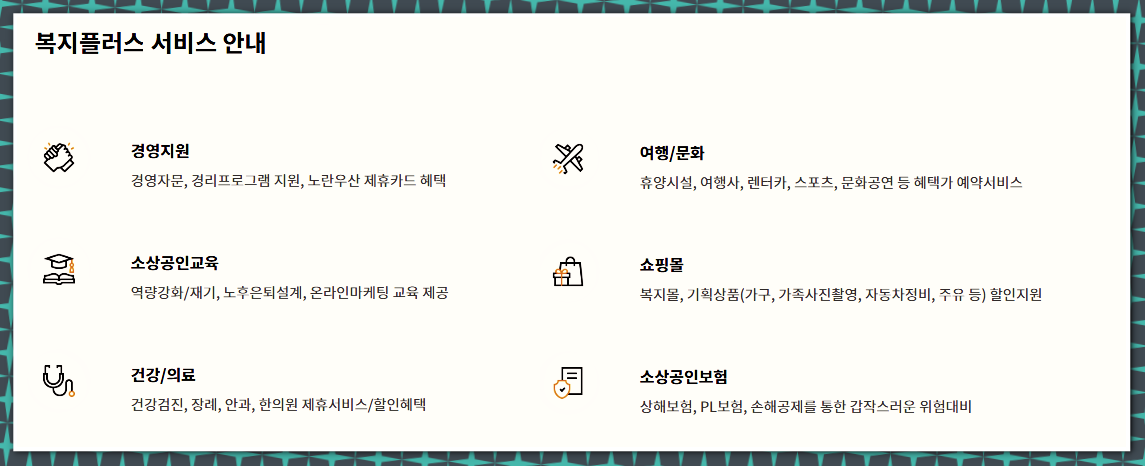 3. 복지플러스 회원 혜택: 가입자는 복지플러스 회원이 되어 국내 숙박시설 예약, 건강검진 지원 등 다양한 복지 서비스를 이용할 수 있습니다. 이는 사업자의 생활 편의와 건강 관리에 도움을 줍니다.