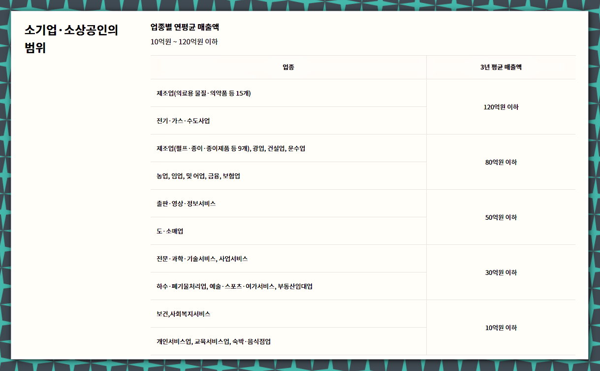 - 120억 원 이하 : 제조업 (의료용 물질, 의양품 등 15개), 가스, 수도, 전기사업