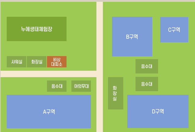 노을캠핑장에는 A구역~D구역 총 4 구역으로 구성되어 있는데요, 편의시설 이용여부에 따라서 따라서 명당위치가 달라지겠죠?