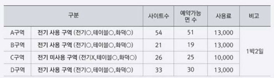 - 예약가능일수 : 최대 2박 3일 / 1인당 최대 1개 사이트가능
