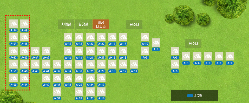 A구역의 맨 끝자리인 50번대 자리는 뒤쪽이 탁 틔여있고 앞쪽으로는 사이트 전체를 조망할 수 있는 위치로 조용하게 시간을 보내고 싶은 분들에게 추천되는 자리입니다.