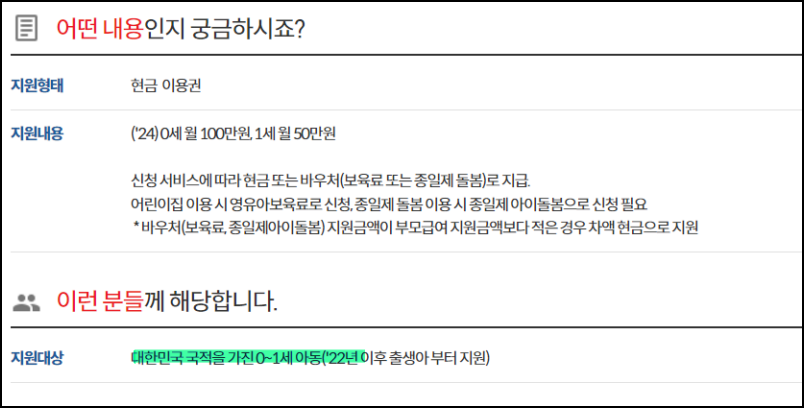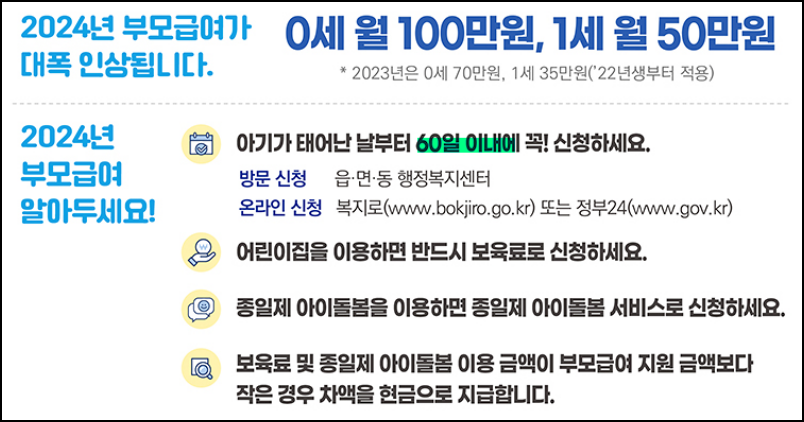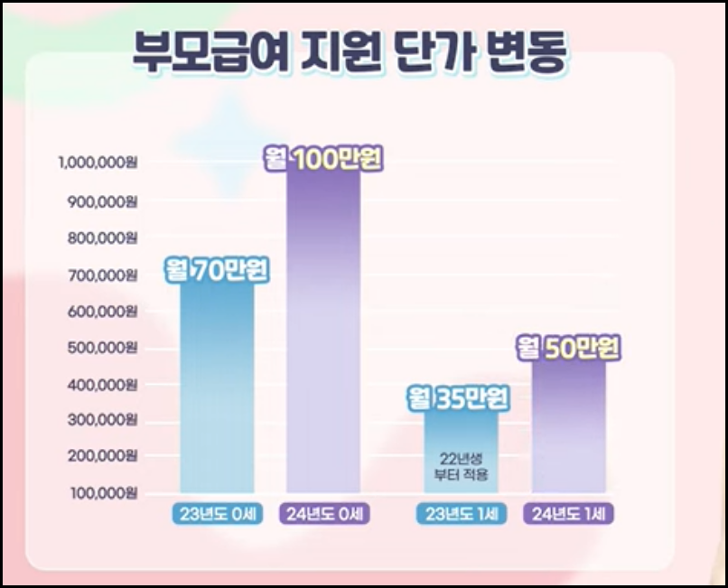2024년 기준으로 부모급여 지원금액이 약 43%가량 인상되어, 만 0세 아동은 매월 100만 원, 만 1세 아동은 매월 50만 원을 현금으로 지급받습니다.