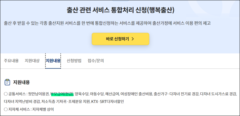 행복출산원스톱서비스는 부모급여뿐만 아니라 첫 만남이용권, 양육수당, 아동수당, 해사급여, 난방비절감, 도시가스경감 등의 다양한 혜택을 한 번에 신청할 수 있습니다.