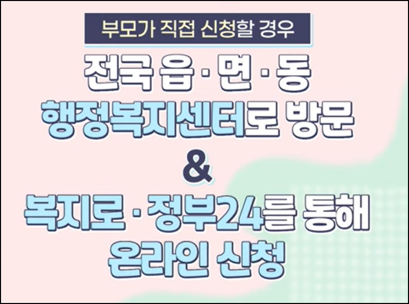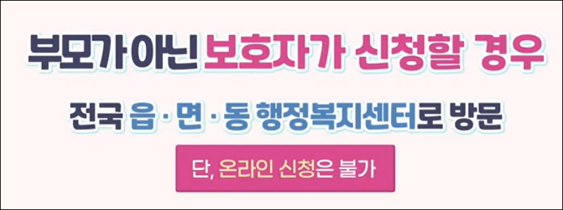 두 번째,읍면동 주민센터를 방문하여 신청할 수 있습니다. 방문신청은 아동의 보호자뿐만 아니라 대리인이 신청할 수 있어 조부모가 키우는 아동이라면, 방문신청하는 것이 편리합니다.