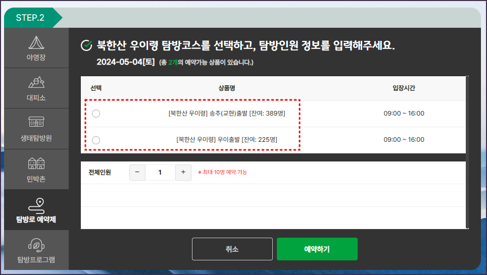 2. step.2 페이지에서는 탐방코스를 선택한 뒤 '예약하기'버튼 선택해 주세요.