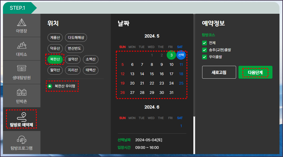1. 예약페이지 step.1 '탐방로 예약제' 선택 후 위치는 북한산 '북한산 우이령'을 선택해 주세요. 이후, 방문하고자 하는 날짜와 탐방코스를 선택한 뒤 '다음단계' 버튼을 눌러주세요.
