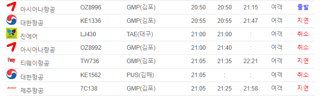 조건을 선택하고 검색버튼을 누르면, 하단에 곧바로 원하는 정보가 표시되는데요, 항공사와 출발지, 계획, 예상, 도착 현황 등에 대한 정보들이 확인됩니다.
