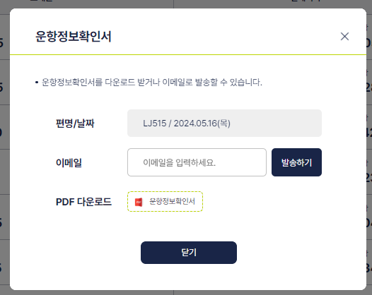 운항정보확인서를 선택하면 항공편명과 날짜, 다운로드를 하거나 이메일로 발송받을 수 있는 팝업창이 뜹니다.