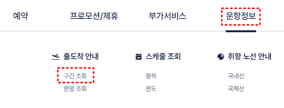 발급을 위해서 진에어 공식홈페이지에 접속 후 [운항정보 > 출도착안내 > 구간 조회 OR 편명조회] 선택