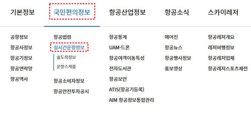 항공정보포털 사이트에 접속하여 [국민편의정보 > 실시간운항정보 > 출도착정보]를 선택해줍니다.