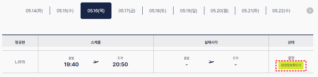 현황정보에서는 비행기의 현재상태, 출발했는지, 도착했는지, 지연되었는지, 취소되었는지 내용들이 표시되며 결항여부는 취소로 표시되어 있는지를 통해서 확인할 수 있습니다.