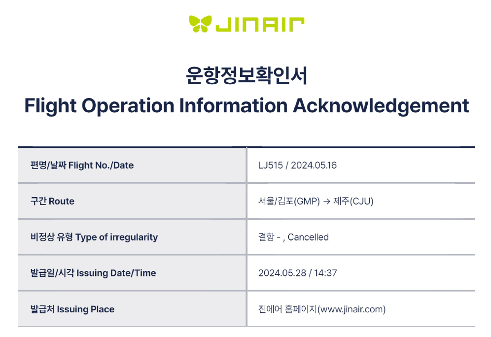 비행기 결항확인서는 각 항공사의 홈페이지를 통해서 발급받아야 합니다. 예를 들어, 진에어의 비행기 결항 확인서 발급방법에 대해서 알아보도록 하겠습니다.