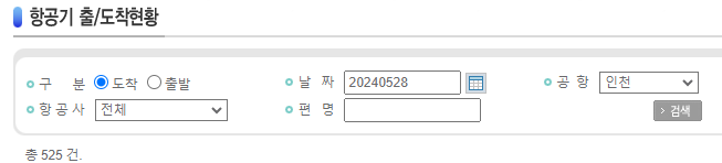 항공기 출도착현황에서는 도착/출발, 날짜, 공항, 항공사, 편명을 각각 선택해서 원하는 비행기 결항여부를 확인할 수 있습니다.