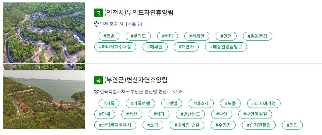- 반려동물 동반 가능 자연휴양림 : 산음, 검마산, 천관산, 화천