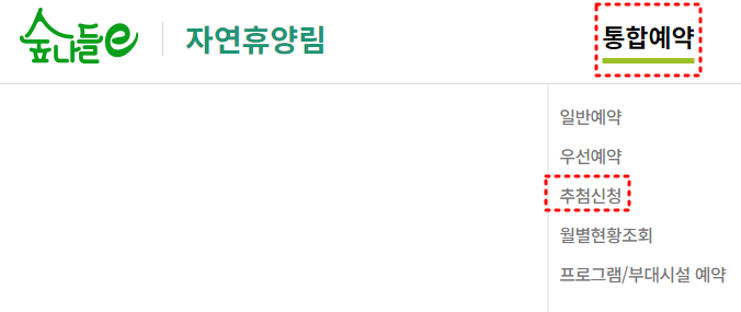 숲나들e 접속 후 [자연휴양림 > 추첨신청] 선택 또는 자연휴양림 [통합예약 > 추첨신청] 선택으로 예약페이지로 이동할 수 있습니다.
