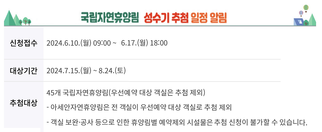 2024년 성수기 숲나들e 추첨제 일정은 6월 10일 오전 9시부터 시작됩니다. 전국의 국립자연휴양림 45곳의 7월 15일부터 8월 24일까지 이용하고 자하는 분들을 대상으로 추첨제 신청을 받는데요, 추첨결과는 6월 20일 날 발표됩니다.