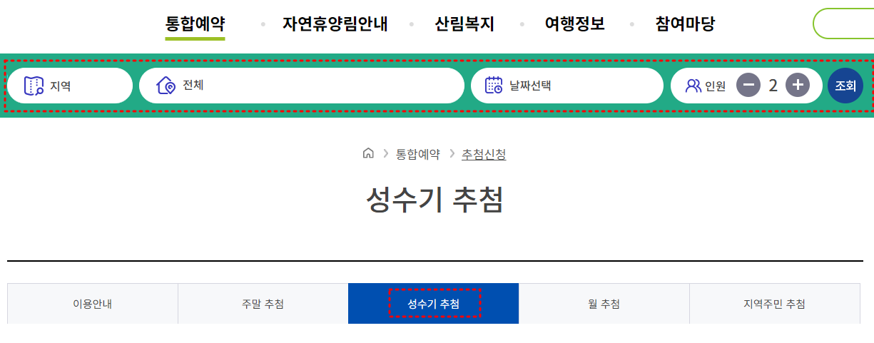 예약페이지로 이동되었다면, 방문하고자 하는 지역과 자연휴양림, 날짜, 방문인원을 선택 후 조회를 눌러주세요. 이때 주의할 점은 추첨종류 중 [성수기 추첨]을 선택하고 예약을 진행해야 한다는 점입니다.