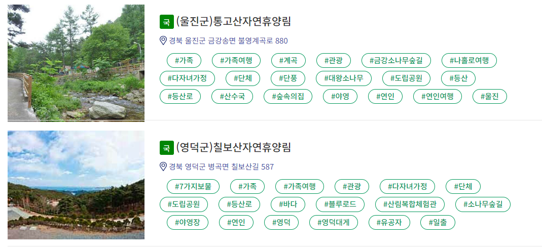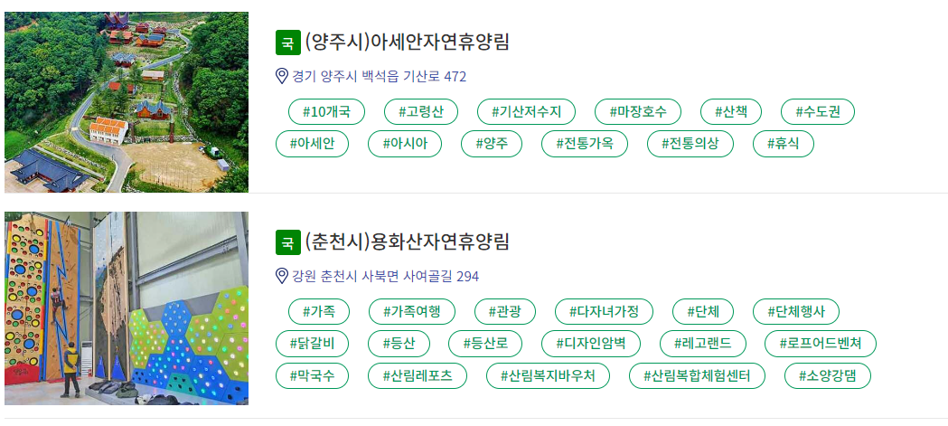 - 반려동물 동반 가능 자연휴양림 : 산음, 검마산, 천관산, 화천