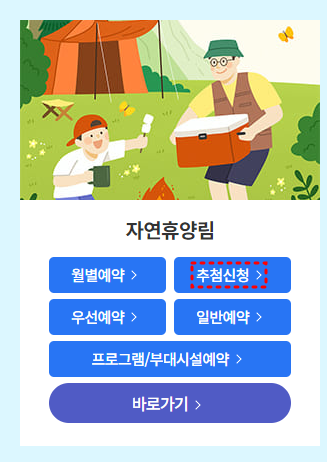 자연휴양림 성수기 추첨제 예약은 숲나들e 홈페이지 '추첨신청'을 통해서 진행됩니다.