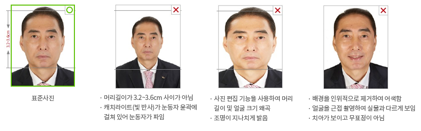 - 머리길이 비율: 사진 내에서 머리길이가 정수리(머리카락을 제외한 머리 최상부)부터 턱까지의 길이가 지나치게 짧거나 긴 경우. 가로 3.5cm, 세로 4.5cm로 인화된 사진파일 기준, 머리길이는 3.2~3.6cm가 되도록 촬영해야 합니다.
