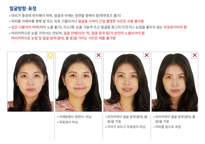- 표정과 포즈: 천연색의 상반신 정면 사진으로, 모자 없이 촬영해야 합니다.