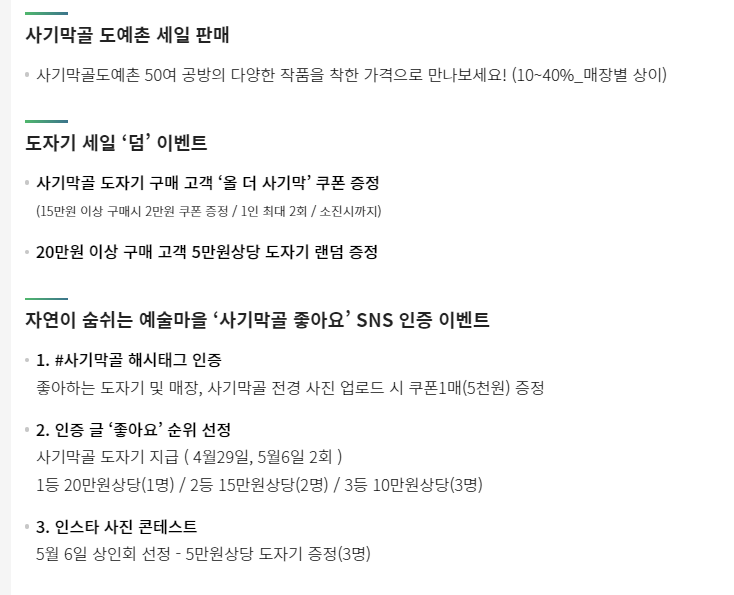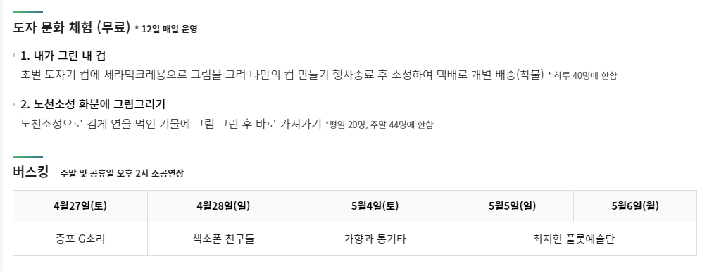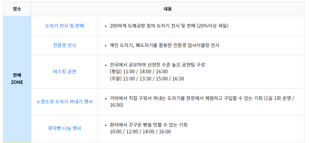 - 축제 기간 중 최대 30% 도자 할인 및 기념품 증정 이벤트