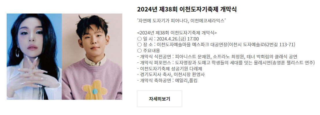 식전공연으로는 피아니스트 문재원, 소프라노 최정원, 테너 박회림의 클래식 공연이 준비되어 있고, 개막식 퍼포먼스, 이천도자기축제 성공기원 다례제, 경기도지사 축사, 이천시장 환영사 등이 진행됩니다. 축하공연으로는 에일리와 폴킴이 무대에 오를 예정입니다.