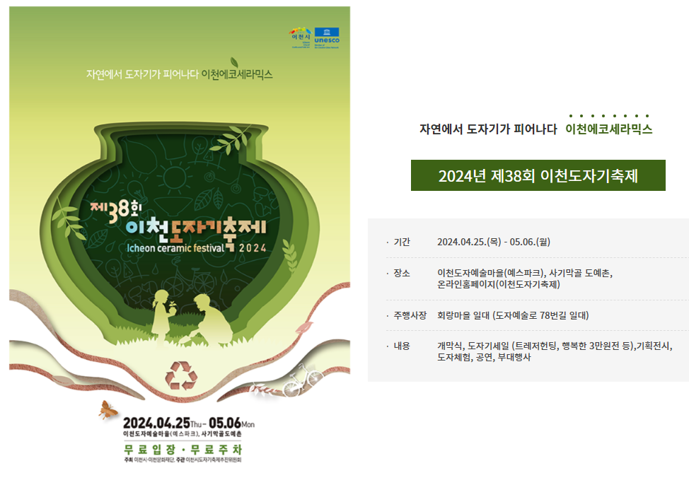 제 38회 이천 도자기축제의 주제는 에코세라믹스로 사용하지않는 플라스틱 용기를 가져오면 도자기 구매 할인쿠폰을 받을 수 있고, 150만원 이상 구입하는 경우 친환경 이천도자식기를 1일 30명 한정으로 증정하는 행사도 진행하고 있으니 꼭 참여해보시길 바랍니다.