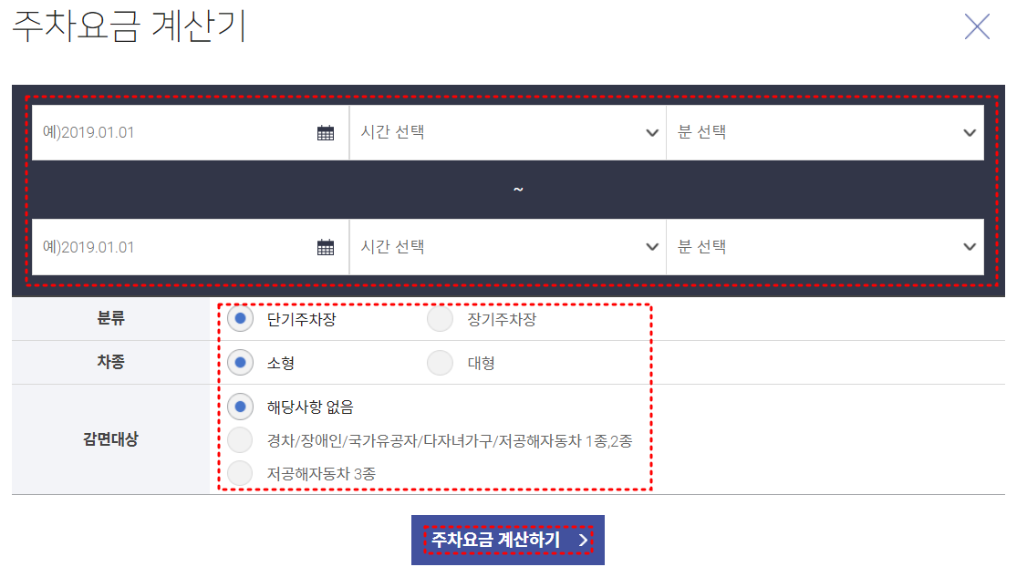 주차요금 계산기에 여행일정과 이용하고 자하는 주차장, 차종, 감면여부를 선택한 후 주차요금 계산하기를 눌러 계산.