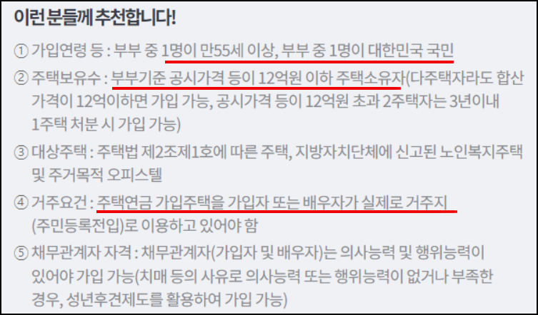 신청자 또는 배우자가 실제로 주민등록상 연금 신청하고자 하는 대상주택에 거주하고 있어야 합니다.