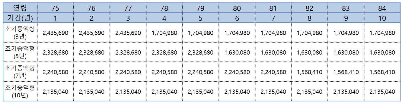 또한, 같은 나이에 연금을 신청할 때, 주택에 가격에 따라서 얼마나 수령할 수 있는지도 비교할 수 있습니다. 예를 들어, 65세에 주택연금을 신청할 경우, 3억 원과 4억 원의 차이는 매월 24만 원 정도의 차이가 발생하는 것을 확인할 수 있습니다.