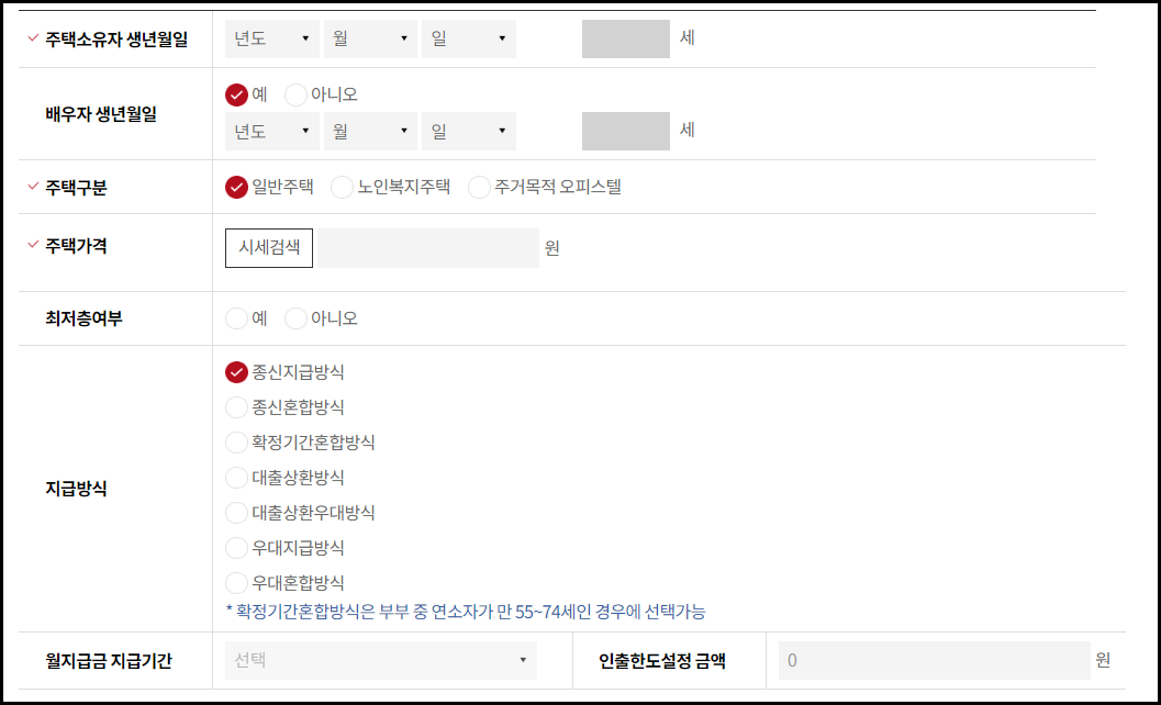 계산 시 신청대상자는 주택소유자의 생년월일, 주택구분, 주택가격, 지급방식 등 정확한 정보를 입력해야 정확한 예상수령금액을 알아볼 수 있습니다.