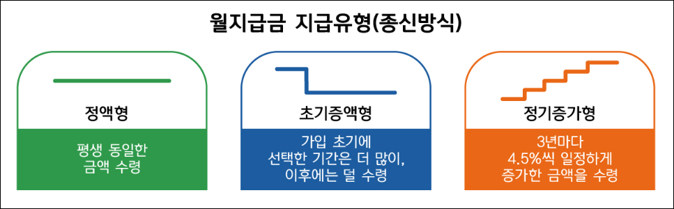 일정기간마다 연금 수령액이 계단식으로 증가하여, 물가 상승에 대응이 가능하며, 초기에는 수령액이 낮지만 반대로 시간이 지남에 따라 수령액이 증가하기 때문에 정년퇴임 하기 전이나, 정기적인 수입이 있는 경우에 많이 선택하는 방식입니다.