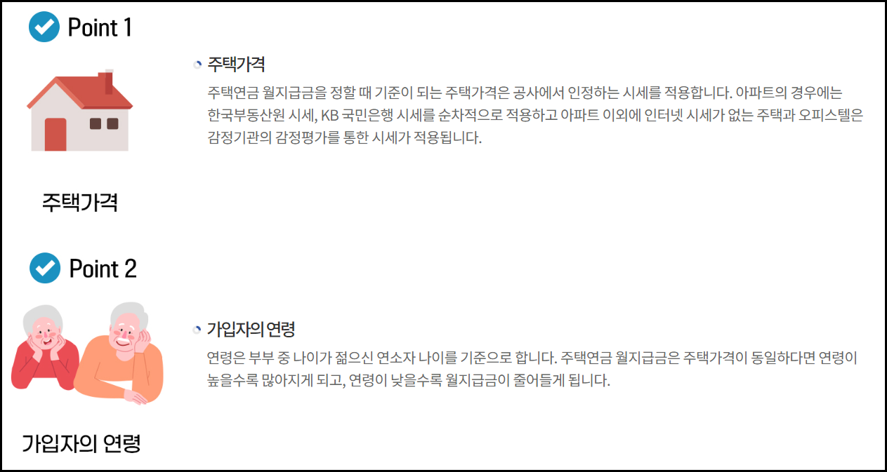 이처럼, 주택연금 수령액은 가입대상자의 나이가 많고 주택가격이 높을수록 매월 받을 수 있는 금액이 많아짐을 알 수 있습니다.