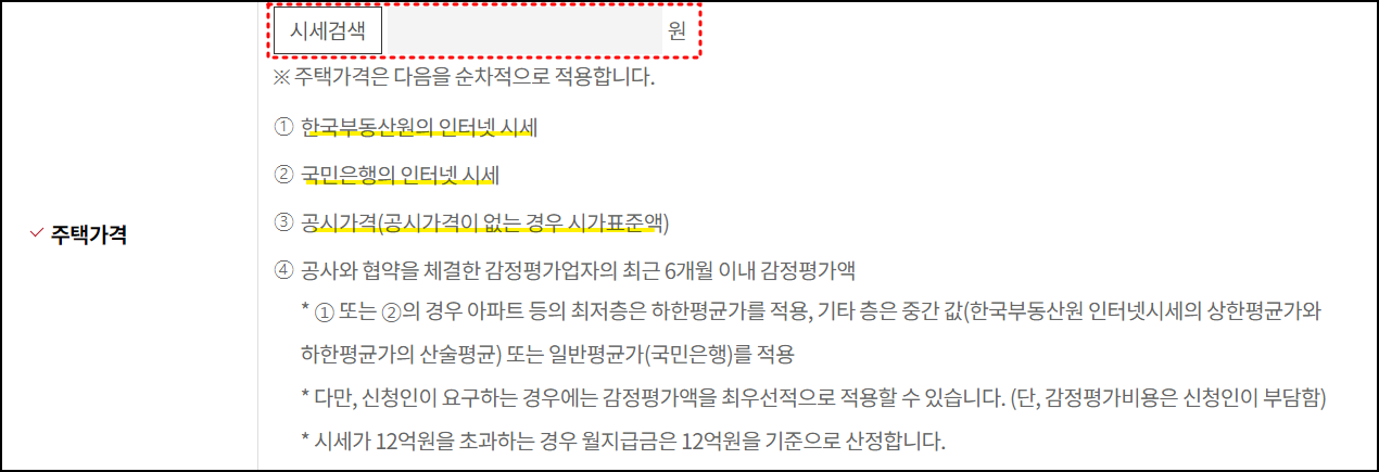 - 담보주택의 가격: 주택의 가치는 부동산테크 인터넷 시세, KB 인터넷 시세, 국토교통부 주택공시가격, 감정평가의 순으로 적용됩니다.