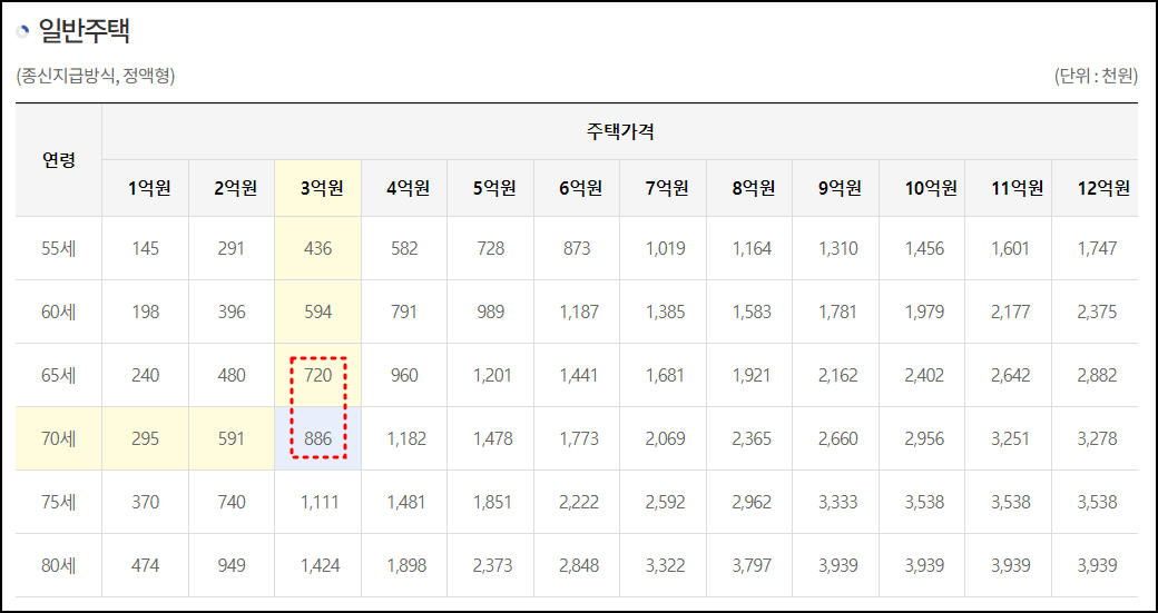 표를 확인해 보면, 3억 원 주택을 가진 사람이 연금을 신청할 경우 65세는 매월 72만 원, 70세는 88만 6천 원을 지급받을 수 있는 것을 알 수 있습니다.