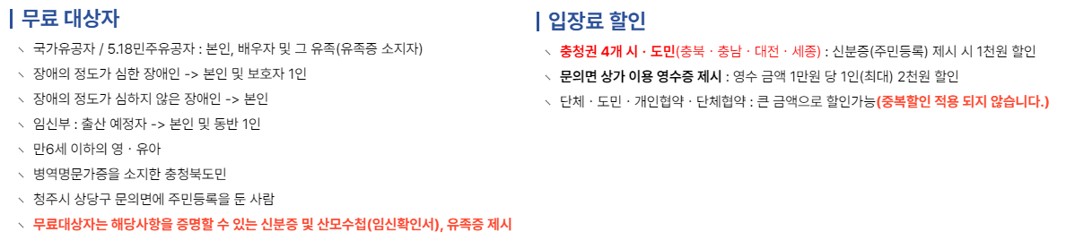 이외에도 국가유공자 및 장애인, 임산부, 영유아, 충북도민, 청주시 문의면 거주자 등에 한해서는 무료입장이 가능하며, 충청권 4 개시도민과 문의면 상가 이용영수증 등을 제출하면 입장료 할인 적용을 받을 수 있습니다.